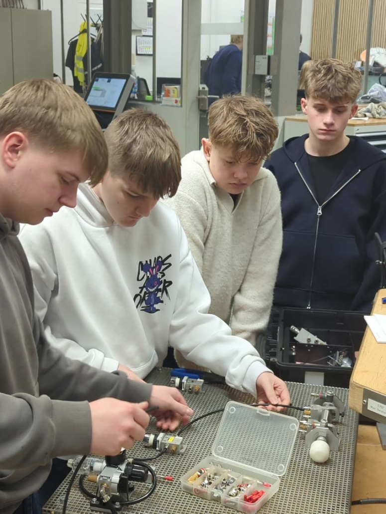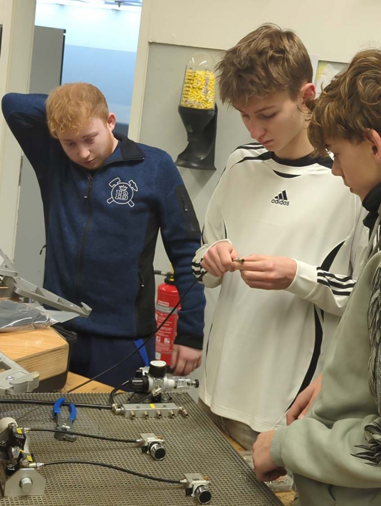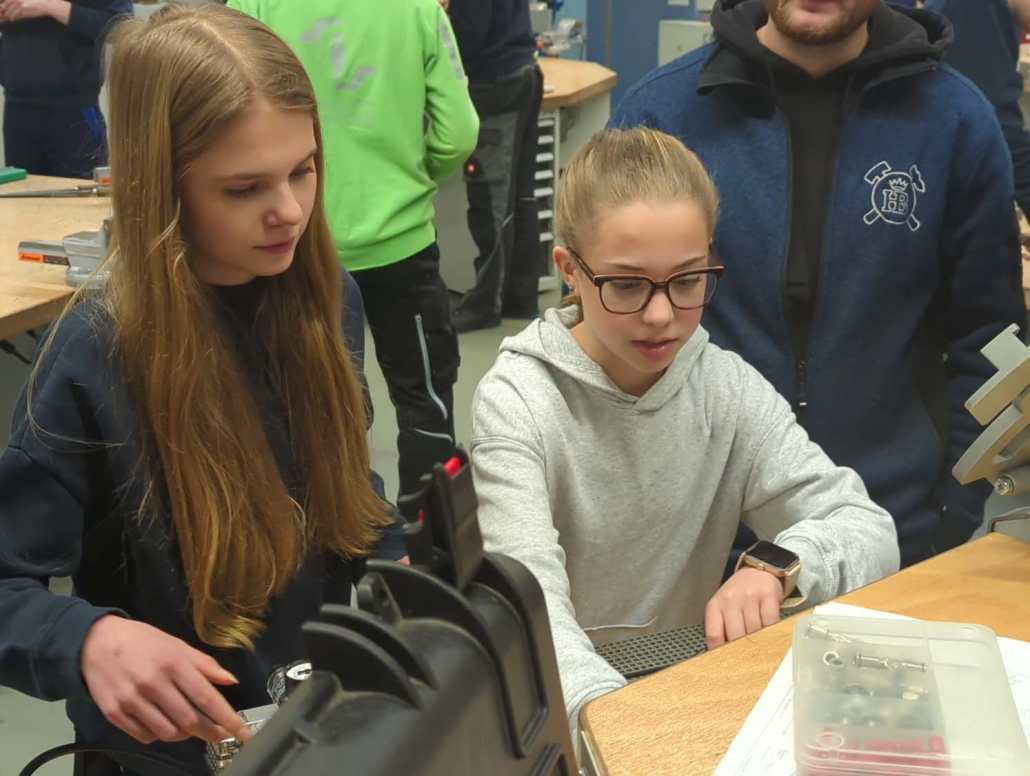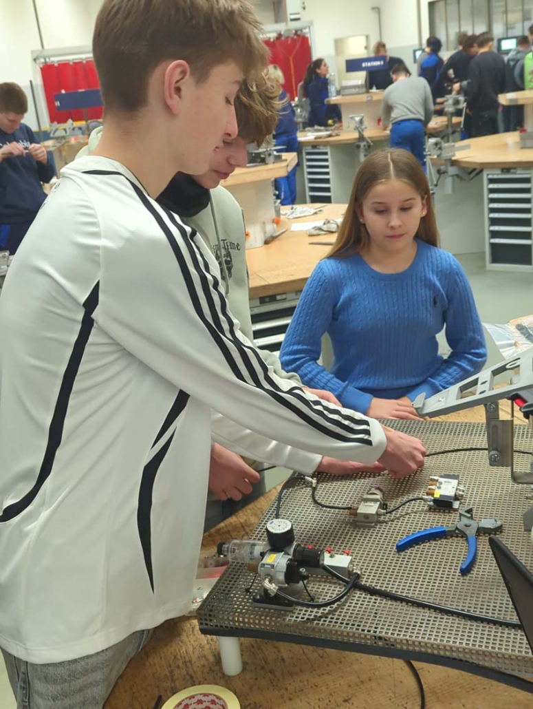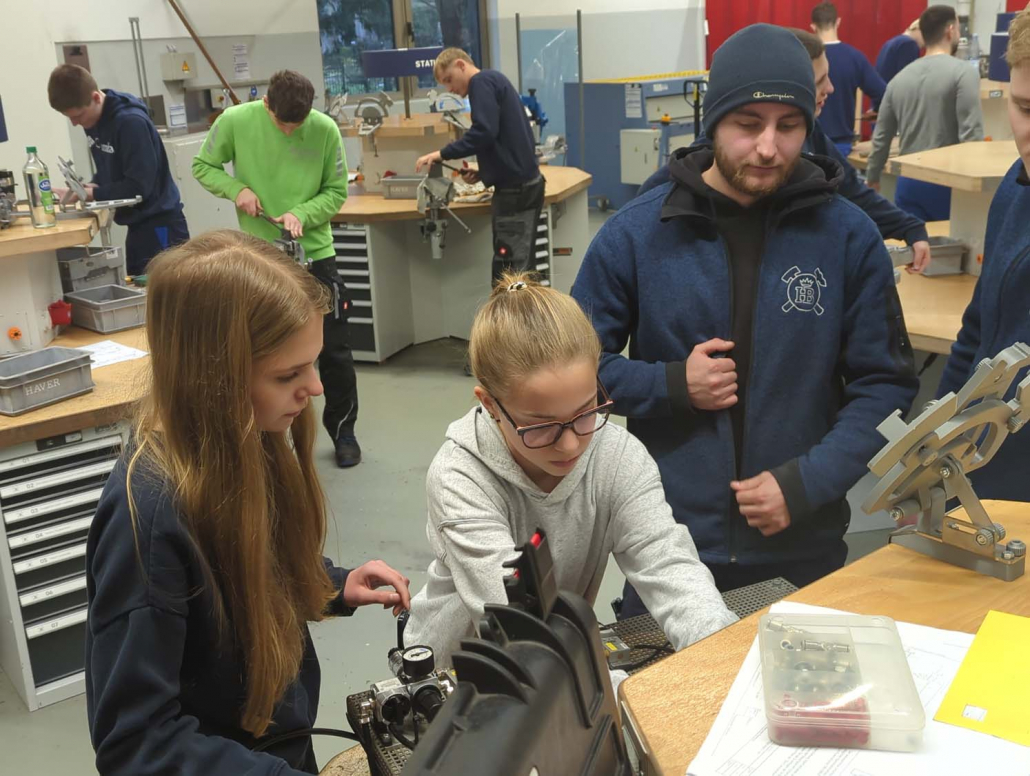 Vor Ort zeigte sich, wie vielfältig Arbeitsfelder in Mathematik, Informatik, Naturwissenschaften und Technik sein können. Nach ersten Einblicken in Abläufe und Arbeitsbereiche ging es für die Jugendlichen schnell ins praktische Arbeiten. Elektrische Schaltungen wurden nach Plan aufgebaut, Drahtspulen in Elektromotoren eingefädelt und Anlagen fachgerecht verdrahtet. Einige Gruppen sammelten Erfahrungen beim Schweißen, andere setzten sich mit pneumatischen Steuerungen auseinander oder brachten Schulungsroboter in Bewegung.