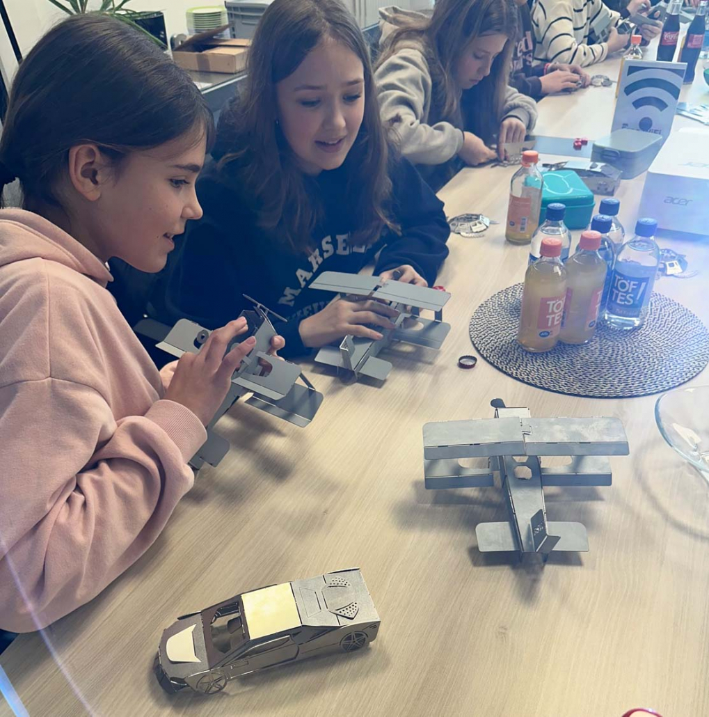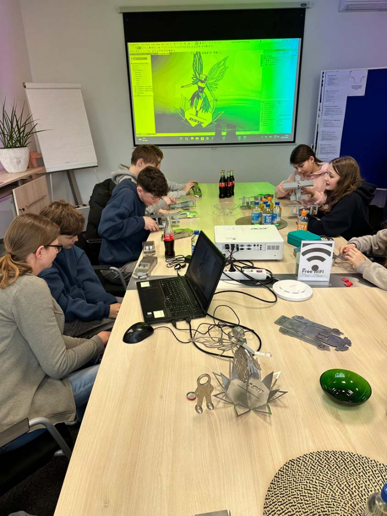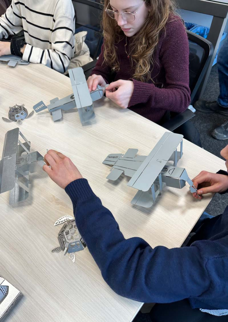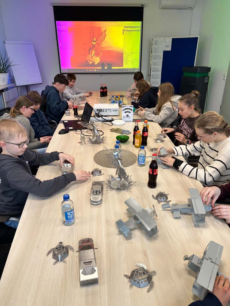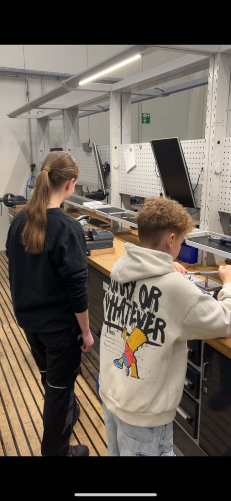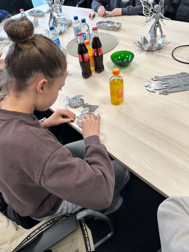 Auch digitale Arbeitsfelder spielten eine große Rolle. Am Computer konstruierten Schülerinnen und Schüler Bauteile und erlebten anschließend, wie aus gelaserten Metallblechen durch präzises Biegen greifbare Objekte entstanden. Einen besonderen Eindruck hinterließ der Einsatz von Virtual-Reality-Brillen: In einer virtuellen Umgebung konnten die Jugendlichen eine Fertigungsanlage für Auto-Akkus erkunden – ein Perspektivwechsel, der moderne Produktionsprozesse auf eindrucksvolle Weise erlebbar machte.