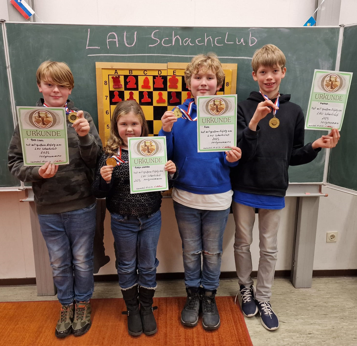 Das Bild zeigt Ben, Ronja, Rene und Nathan im Anschluss an das heutige kleine Schachturnier bei der Medaillen- und Urkundenverleihung.