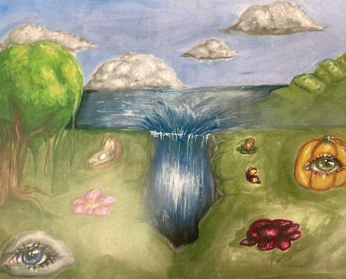 Die Aufgabe bestand darin, eine surrealistische Landschaftsdarstellung nach Salvador Dalì anzufertigen, wobei verschiedene Aspekte umgesetzt werden mussten: die Gegenstände sollten schmelzen, in einen anderen übergehen oder eine unwirkliche Größe besitzen. Malin hat alles mit Präzision und besonderem Detailreichtum gezeichnet und coloriert..