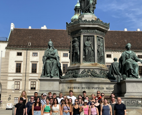 Am Sonntagabend stiegen 33 SchülerInnen aus dem Matheleistungskurs von Herrn Frönd und dem Deutschleistungskurs von Frau Albat in Begleitung von Frau Herich und Frau Fox mit guter Laune in den Bus Richtung Österreich. Einige Stunden später kam die Gruppe mehr oder weniger ausgeschlafen in Wien an und nach einer Mittagspause wurde die freie Zeit genutzt, um schon mal die Stadt zu erkunden.