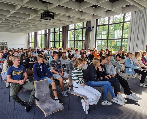 Etwa 35 Alaudiner des Abiturjahrgangs 2010 trafen sich am Samstag zum wegen Corona zweimal verschobenen 10jährigen Abitur wieder. Nach dem Wiedersehen vor der Schule öffneten sich um 15 Uhr die Türen der alten „Penne“ und Schulleiter Malte Prigge begrüßte die Alumni zurück auf dem grünen Teppich.