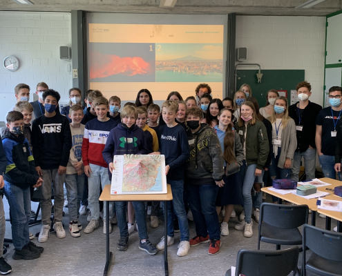 Gemeinsam mit Studierenden des Instituts für Didaktik der Geographie (IfDG) der WWU Münster erlebten die Schülerinnen und Schüler der Klasse 7B einen besonderen Einblick in das geographische Arbeiten mit Karten.