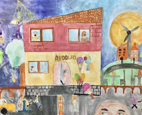 Die Gäste sitzen im Sonnenschein und genießen Kuchen, Eis und kühle Getränke, als plötzlich ein Unwetter aufzieht und alles durcheinander wirbelt. Die Kontraste und Übergänge „hell-dunkel“ und „ruhig-stürmisch“ hat Evelina M. aus der Klasse 6B detailreich und mit vielen spannenden Ideen gemalt.