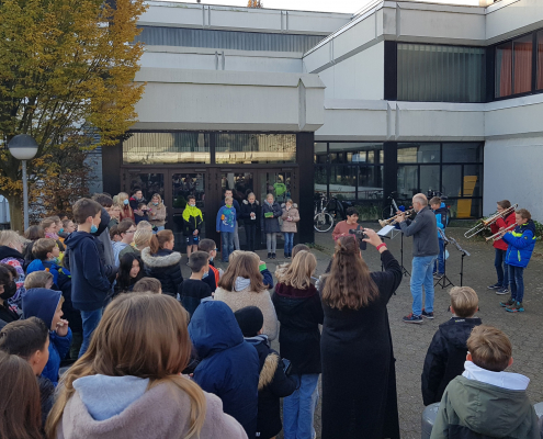 Das Fest des heiligen Sankt Martin wurde in diesem Jahr musikalisch untermalt. Unter der Leitung von Matthias Hothneier (Trompete) spielten Tristan L. (Klarinette), Philip F. (Trompete) und Justus S. (Trompete) aus der Junior-Big-Band sowohl auf dem Schulhof als auch im Pädagogischen Zentrum vor zahlreichen beeindruckten Mitschülerinnen und Mitschülern bekannte Sankt-Martins-Lieder.