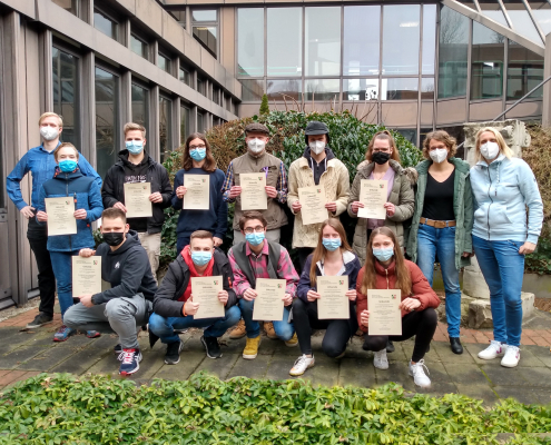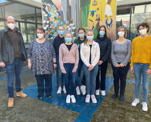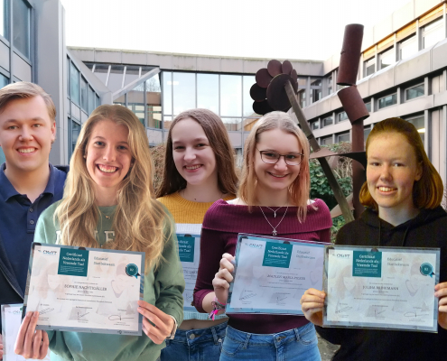 Trotz der Pandemie und den damit verbundenen Unsicherheiten bezogen auf außerunterrichtliche Aktivitäten, konnte auch in diesem Schuljahr 2020/2021 das niederländische Sprachenzertifikat B2 der Universität Leuven abgenommen werden. Unter Einhaltung der Abstands- und Hygieneregeln haben Jolina B., Jette L., Sophie N., Madlen P. und Jan U., alle aus der Jahrgangsstufe Q2, erfolgreich ihre Sprech-, Schreib- und Hörkompetenzen unter Beweis gestellt. Sie erwarben damit die Berechtigung, an einer Hochschule/Universität in Flandern oder in den Niederlanden zu studieren.