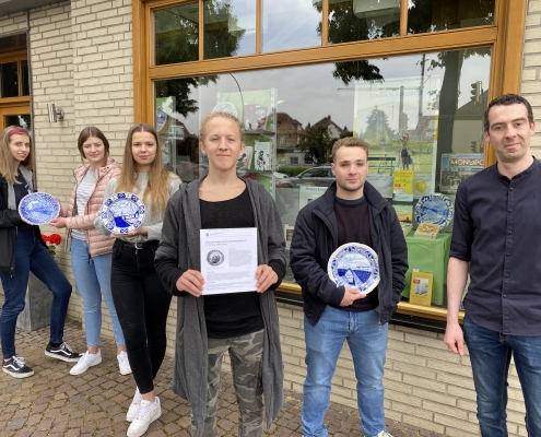 Im Kunstunterricht der Q2 entstanden altherkömmlich anmutende Zierteller. Sie strahlen, wie es die niederländische Keramiktradition verlangt, im Delfter Blau über den Tellerrand hinaus, sind jedoch modern interpretiert. Seit dieser Woche sind sie in den Schaufenstern der Buchhandlung Ebbeke öffentlich ausgestellt.
