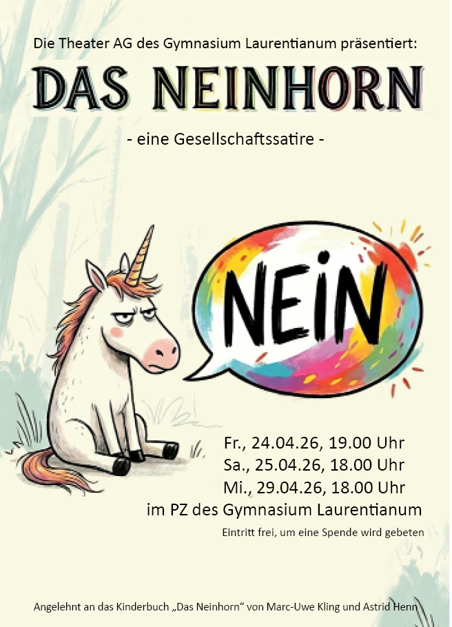 Wir (die Theater AG, Philipp Wagner und Moritz Mai) möchten Sie/euch ganz herzlich zu den Theateraufführungen des Schauspiels „Das Neinhorn“ nach dem gleichnamigen Buch von Marc-Uwe Kling und Astrid Henn einladen: